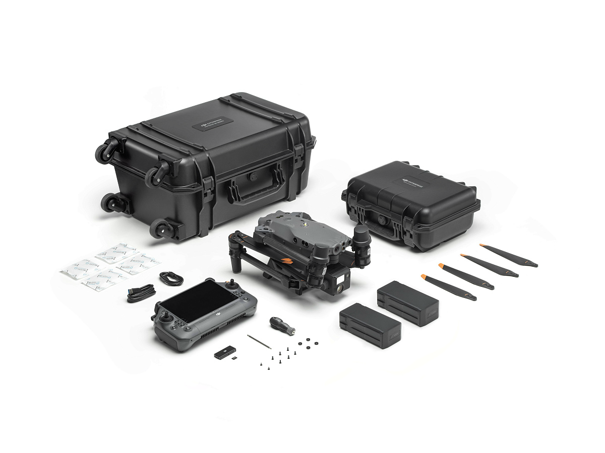Matrice 30 Series (M30 или M30T) поставляется с DJI RC Plus, двумя интеллектуальными полетными батареями TB30, одной интеллектуальной аккумуляторной станцией BS30 и кейсом для хранения дрона.