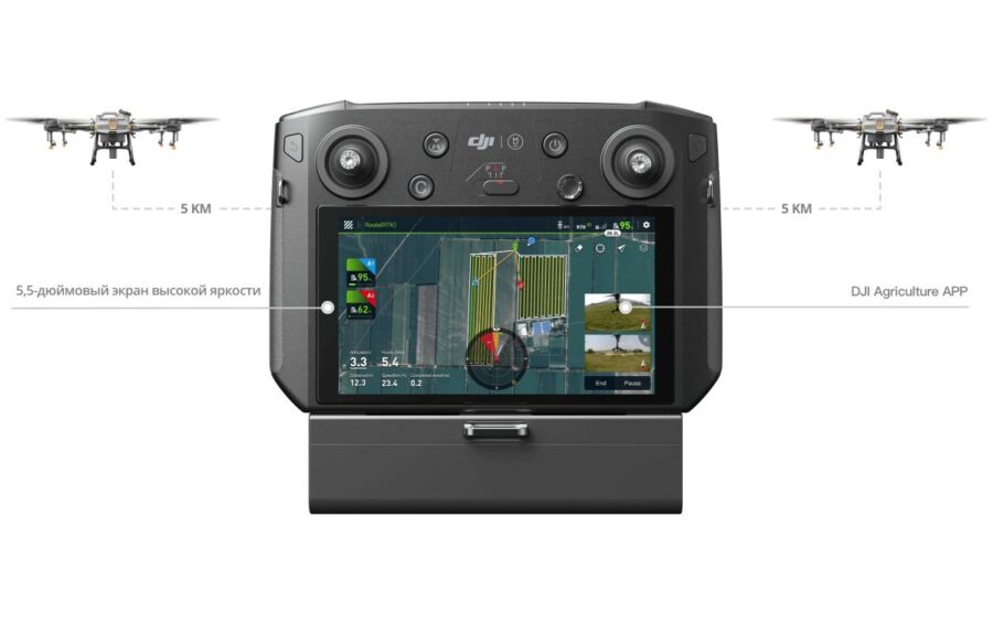 Обновленный пульт управления поддерживает стабильную передачу изображения на расстоянии до 5 км, что на 67% больше, чем у предыдущего поколения. [1] 5,5-дюймовый экран высокой яркости обеспечивает четкое изображение даже в условиях слабого освещения. Для повышения производительности один пульт управления может управлять несколькими дронами одновременно. Стандартный модуль высокоточного позиционирования RTK реализует планирование операций на сантиметровом уровне. Дополнительные улучшения включают усиление сигнала, защиту от помех и стабильность работы. Новое приложение DJI Agriculture обеспечивает более плавную работу с системой и более интуитивное управление.