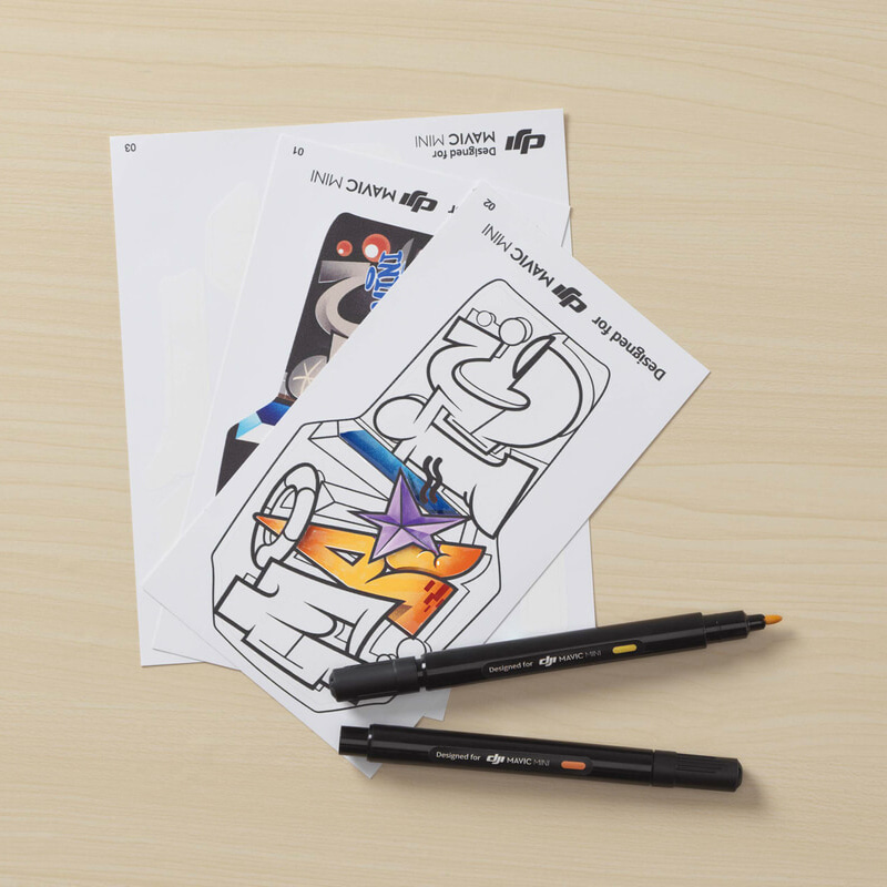 Творческий набор DJI Mavic Mini DIY Creative Kit включает в себя пустые наклейки и цветные маркеры, которые позволяют пользователям персонализировать свой Mavic Mini