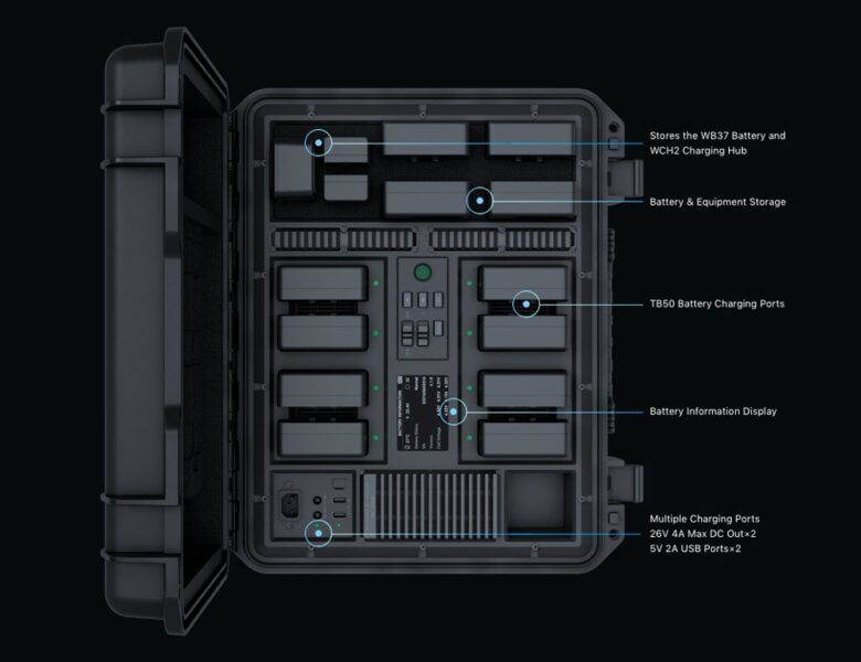 Прибор поставляется внутри вместительного кейса, в который помещается 12 аккумуляторов TB50 Intelligent Battery, два аккумулятора WB37 Intelligent Battery и один зарядный концентратор WCH24. Кейс оборудован колесиками и выдвижной ручкой для удобства транспортировки.